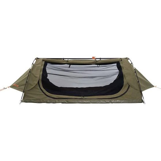 You’ll be having a bevvy around the campfire in no time with the simple set up of the Dusk to Dawn Swag. Simply peg it out, insert the 2 compose end poles and the trigger locking ridge pole and you are ready to go. It has excellent ventilation with 2 large super-fine 125gms mesh doors and 2 zip down windows. The storm covers convert to awnings for added shelter and protection from the elements (poles sold separately).