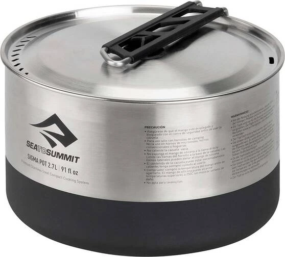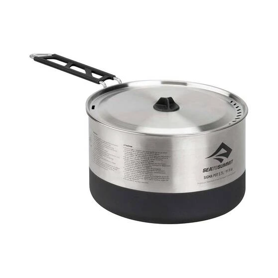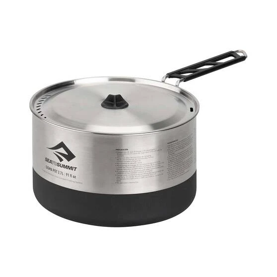 Engineered with premium marine-grade stainless steel, Sea to Summit’s SigmaPot range is strong, lightweight and offers a durable, abrasion resistant and easy-to-clean cooking surface for your outdoor camp kitchen needs. Designed for compact packing and convenient handling, the SigmaPot’s unique patent-pending PIVOT-LOCK handle rotates horizontally, locking in place for a secure and ergonomic grip when in use and folds away keeping the lid locked to the pot for low-profile storage. The textured base helps to keep your pot from sliding around on camping stoves, while the integrated LID KEEP cleverly stores the straining lid out of the dirt. The compact nesting SigmaPots are compatible with SigmaPans, DeltaLight range of camp dinnerware and also our aluminium AlphaPots and AlphaPans.
