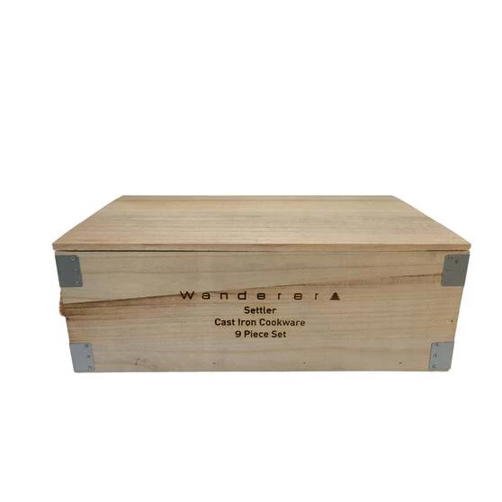 If you’re looking for a cooking set for your next camping adventure then dont look past Settler 7L Cast Iron 9 piece set by Wanderer. This set has everything you need to make cooking over the campfire a breeze. The Settler 9 piece set comes with a 7L/9QT camp oven with trivet, perfect for baking and cooking over the coals. It also includes both 25cm and 20cm frypans for frying up your bacon and eggs in the morning. The Double jaffle iron is perfect for cooking up some campfire toasties! It also comes with a lid lifter, lid stand, leather glove and a handy wooden storage crate. This set is pre-seasoned and ready to use. No need to muck around getting it ready, simply take it out of the box and start cooking up a storm! Perfect to feed the whole family, the Settler 7L Cast Iron set from Wanderer is certain to make life easier on your next camping trip!